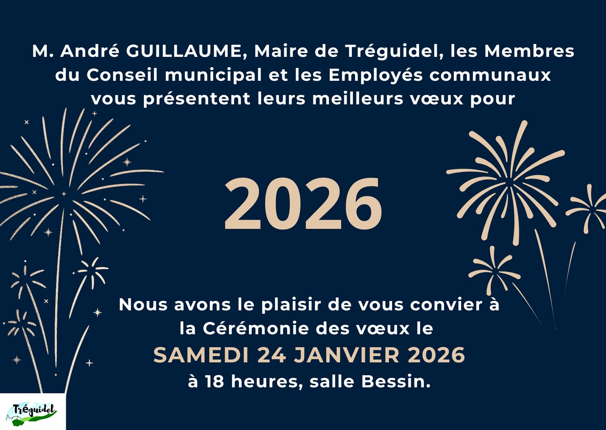 M. André GUILLAUME, Maire de Tréguidel, les Membres du Conseil municipal et les Employés communaux vous convient à la Cérémonie des vœux.